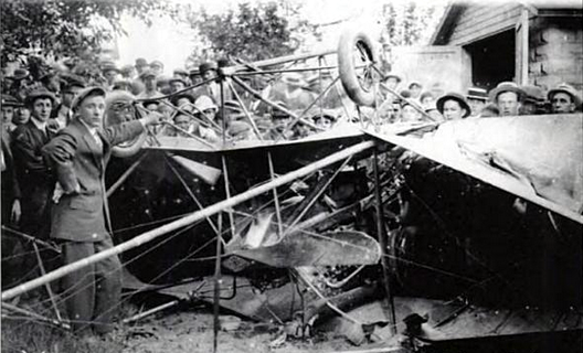 | Spectators are gathered around the remains of Earl Sandt's airplane after it crashed during an air show at the "June Festival" in Grove City. |